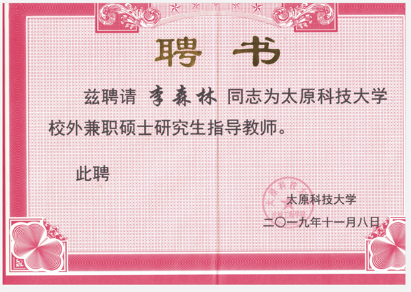 卷板機 >> 新聞中心 >> 我司工程師李森林受聘為燕山大學等校碩士生導師